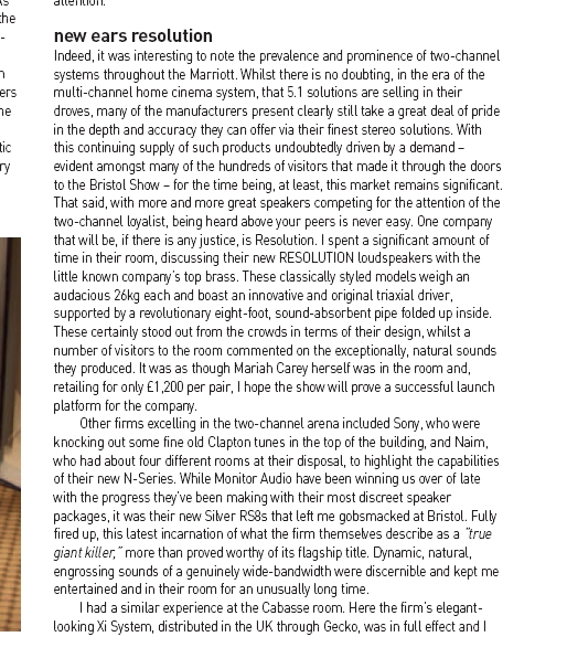 Larger mainstream magazines like What hifi, and hi fi choice carried major advertising for us at the show, and included us in their show guides, but have so far declined to do a proper review of our loudspeaker as they required (in 2005) a list of at least 15 dealerships nationwide, which we do not yet have.Before the show, hifi choice agreed to do a review, with out 15 dealerships, but afterwards changed their minds, chief reviewer Paul Messenger has been 'very impressed' at the show, most of all that the room was so packed he couldn't get a seat during his visit, but Paul has said he doesn't take much notice of sound at show, and arranged ta personal demo at his home which has now been done January 2006(most impressed). Winter 2005/6 we now extend warranty to 30 money back gaurantee(subject to conditions), which is now acceptable for the magazine reviewers (since increasingly many new products dont suit dealership portfolio/margins anymore, and are sold direct this way to keep the prices affordable e.g. BOSE)